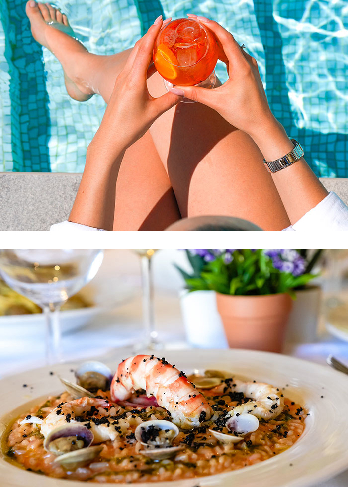 The rate includes welcome drink, full board treatment with a choice of menu featuring four first courses and four second courses (meat or fish) and a buffet of side dishes and fruit, 1/4 wine and 1/2 mineral water for each meal consumed, and a TYPICAL EASTER LUNCH.